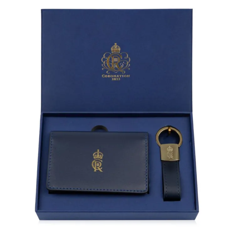 Leather Card Wallet And Keyring Set, Featuring King Charles Iii’S Cypher Embossed In Gold On Leather. Gold Plated Keryin…