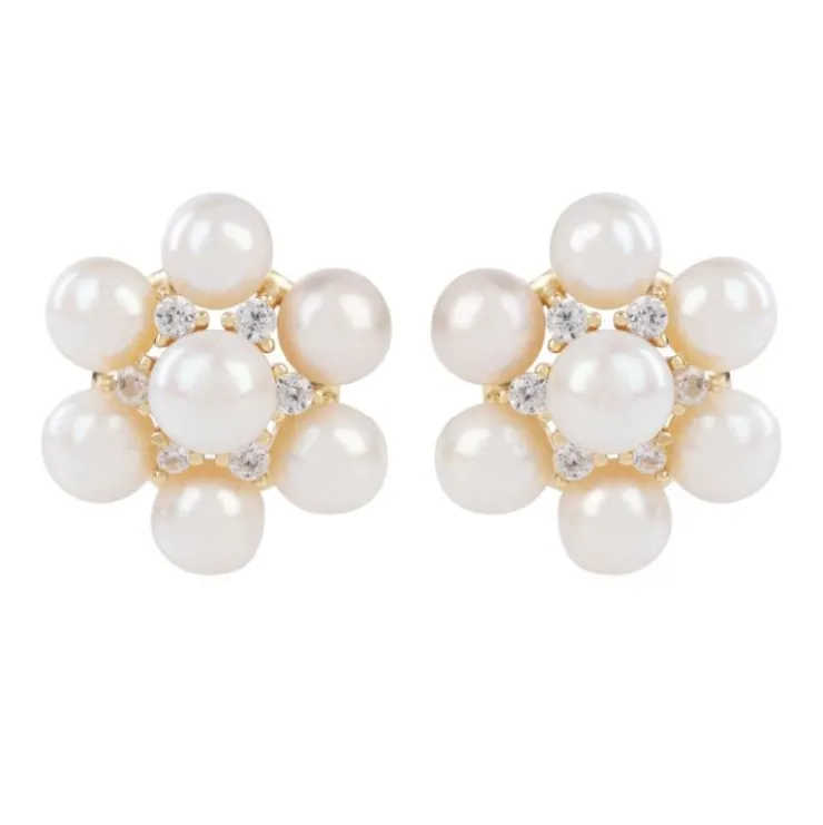 Stud Earrings With White Pearls Forming The Petals Of The Flower And A Cubic Zirconia In The Centre. Gold Plated 925 Stu…
