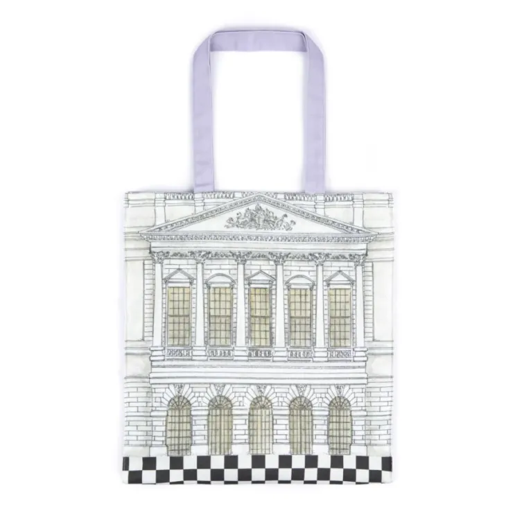 A Spacious, Organic Cotton Tote Bag With Three Designs. Illustrated With The Exterior Of Queen Mary’S Dolls’ House On One Side And A Striking, Purple Graphic On The Opposite. The Lining, Which Can Also Be Turned Inside Out, Reveals A Pattern Of Illustrated Miniatures Taken From Real Items In The Doll’S House.