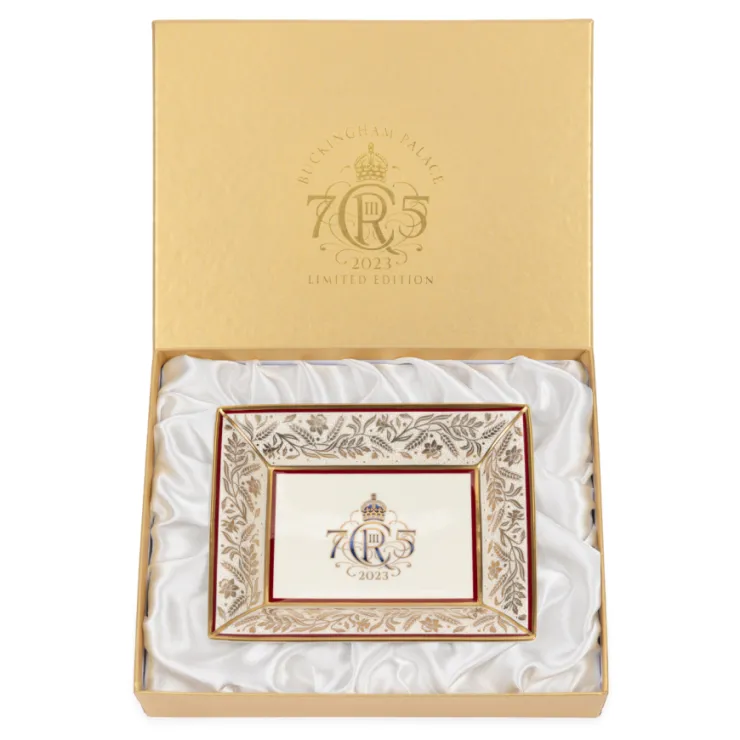 A Limited Edition Of Only 75, This Fine Bone China Desk Tray Is A Unique And Charming Keepsake. At It’S Centre Is A Special Variation Of The King’S Cypher Designed To Mark His Majesty’S 75Th Birthday. Surrounded By Oak Leaves And Wheat Ears Representing Strength And Prosperity, With A Border Of Red And Gold And Hand Finished With 22 Carat Gold Elevates The Whole Piece.